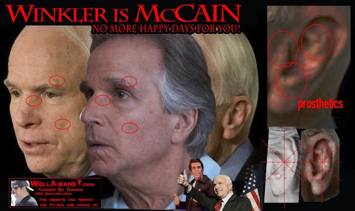 You did ask They've really jumped the shark this time! I remember pieces of his face falling off, and when the media blamed it on his cancer symptoms, and some conspiracy sites blamed it on his "reptilian" shapeshifting, I knew that the whole character that is John McCain was fake. But Ed Chiarini, aka Dallasgoldbug, has provided the photographic evidence to prove that the Arizona senator is a fake character portrayed by Henry Winkler. please log in to view this image If you've ever seen John McCain speaking and walking, the similarities to Winkler's mannerisms are self-evident, once the connection is made. In September 2011, Winkler was made an honorary Officer of the Order of the British Empire(OBE) "for services to children with special educational needs and dyslexia in the UK. Here is Henry Winkler speaking recently about his dyslexia: According to the Huffington Post, "McCain is the first U.S. senator to publicly call for a military attack on Assad's regime. During his floor remarks, he said more than 7,500 lives have been lost in Syria amid the uprising and that the United Nations has declared Syrian security forces guilty of crimes against humanity." I suppose that McCain has not read my post on Assad's ties to the CIA. Let's discuss the ramifications. McCain is just another fake actor puppet, employed by his masters to spit out propaganda in support of more war, more death, more destruction. I wonder if Henry Winkler has any moral conscience. The nerve of him pretending to get a kick out of going to schools and talking to children about his dyslexia, and then putting on the facial latex for his role as McCain, and calling for military airstrikes on innocent children. That's one twisted criminal mind. I'm sure there are hundreds of Patriot websites that would know what to do with this type of intelligence information on a character for who they have questioned the veracity of his Vietnam-era war stories. Henry Winkler is also a Vietnam war vet, not in real life, but in a 1977 movie, Heroes. He did produce an awesome show in MacGyver, I have to give him credit for that at least... please log in to view this image