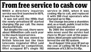 It's good to talk - if you can afford it - if not you can always get a loan from 118118 ( it will only cost you an arm and a leg ) Well - my mother has certainly been 'milked' - it won't happen again !https://encrypted-tbn1.gstatic.com/...vKFZw7rl73UWa5hI5qrO3P8p0XC4gAJDjspV7fuxcPzsu If you can magnify the font it's worth reading - just in case you ever feel the urge to use 118118 to find a telephone number. My mother has just had her monthly BT telephone bill. It shows a charge of £7.09 ( without connection cost ), for using 118118 to find a phone number (ONCE)............... All this on top of her costs for an 'anytime' package. I don't expect the enquiry service to be free ( wasn't 192 wonderful ? ) - but ( and especially as mum is already a BT customer ), the charge for using 118118 is outrageous -- when you consider that the information can be found on the internet. This comes a couple of days after she paid SAGA for a renewal of home and contents insurance that was over 300% more than several prices I found on the 'meerkat' site - and she could have got cashback and free cinema tickets. Next time I will make sure that her fingers will do the walking.
